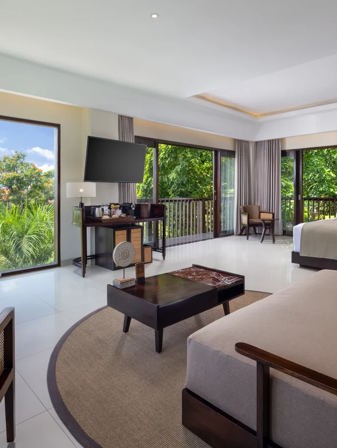 Stunning views and generous space are framed by wraparound glass that capture an uninterrupted 180-degree sweep of jungle canopy, farmlands, and the distant silhouette of Mount Agung. Ideal for sunrise watchers, this suite offers an inviting interior designed for comfort with beautiful views on the ever-changing landscape outside.